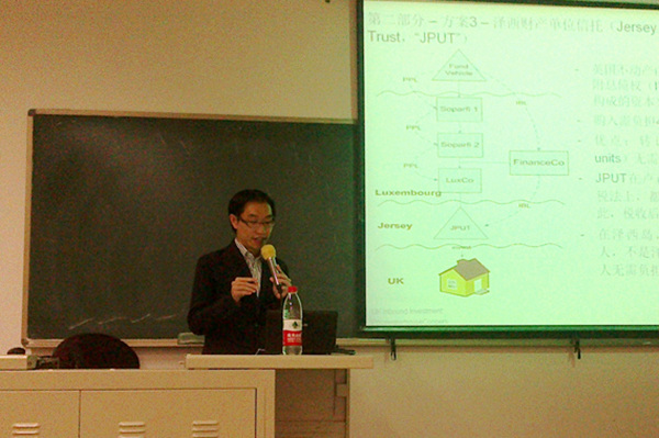吴先生以英国不动产投资为例,详细解释了英国不动产投资的相关税收政策,比较了各种筹划方式,分析不同筹划的法律风险和税务风险。在国际税法前沿问题部分,吴先生从纳税主体、客体和时点选择等方面,结合国际税法领域的最新动态,尤其在全球金融危机的背景之下的各国在税法方面的应对等问题,进行了生动的讲解。