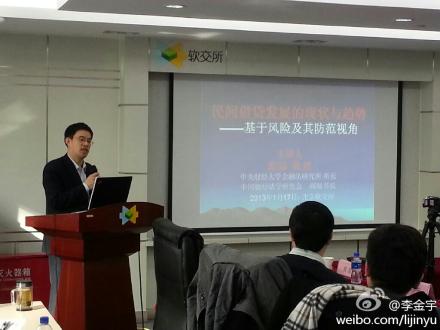 黄震教授以“民间借贷的发展现状及趋势”为主题,从风险及其防范的视角做了一场精彩、深入、务实的演讲。黄教授首先从风险的本源出发,深入分析了风险的特征,由此引出了金融业的高风险特性,进而创造性的提出了民间借贷的五大风险,并逐一对其进行了深入分析,最后提出了防范和化解这些风险的理念和具体措施,得到了与会嘉宾的强烈共鸣。